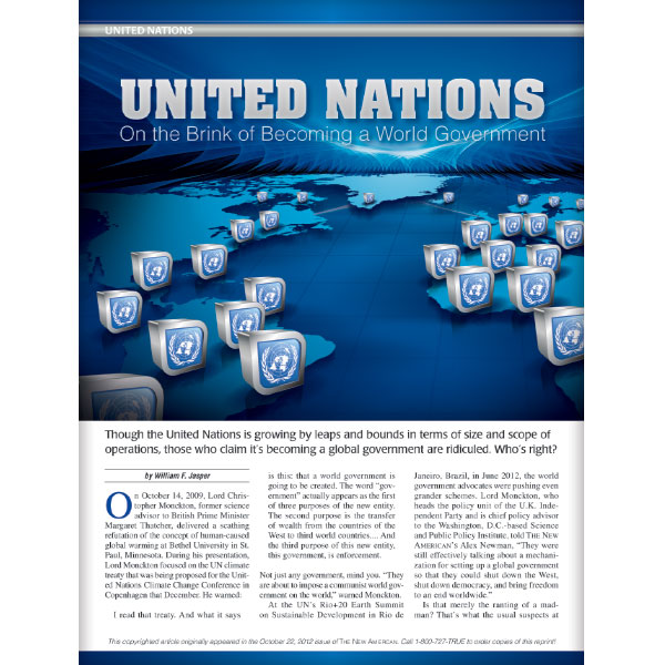Twelve-page, four-color reprint adapted from an article that appeared in the October 22, 2012 issue of The New American β pgs. 10-16. Includes a map of “The Current State of the UN”. (2012, 12pp)